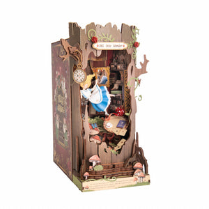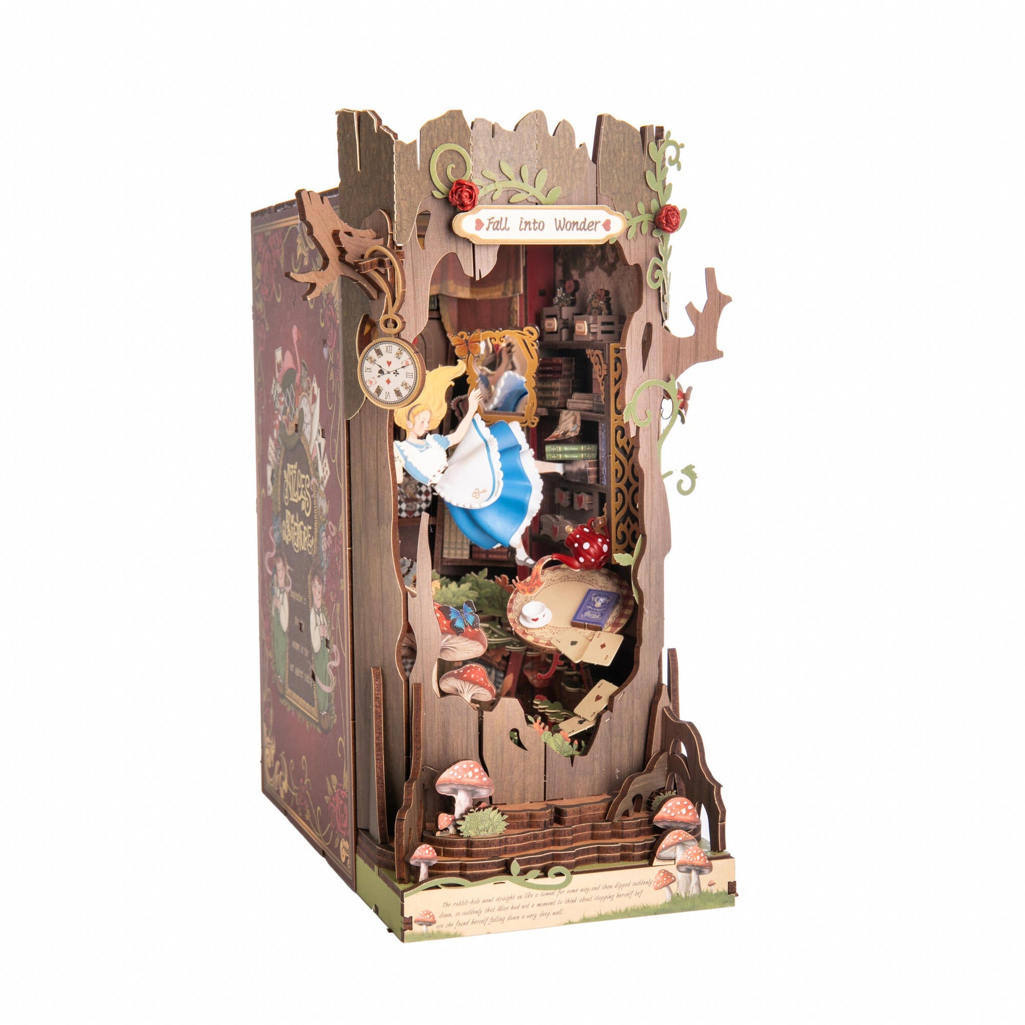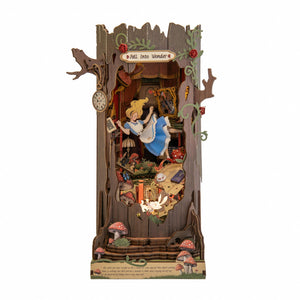 Step into the pages of a beloved classic with this DIY miniature book nook kit, a magical tribute to curiosity, whimsy, and wonder. As you build, watch Alice tumble gracefully down the rabbit hole, surrounded by a swirling flurry of falling treasures-chessboards, teacups mid-pour, curious cupboards, and floating saucers, all frozen in that dreamy descent.