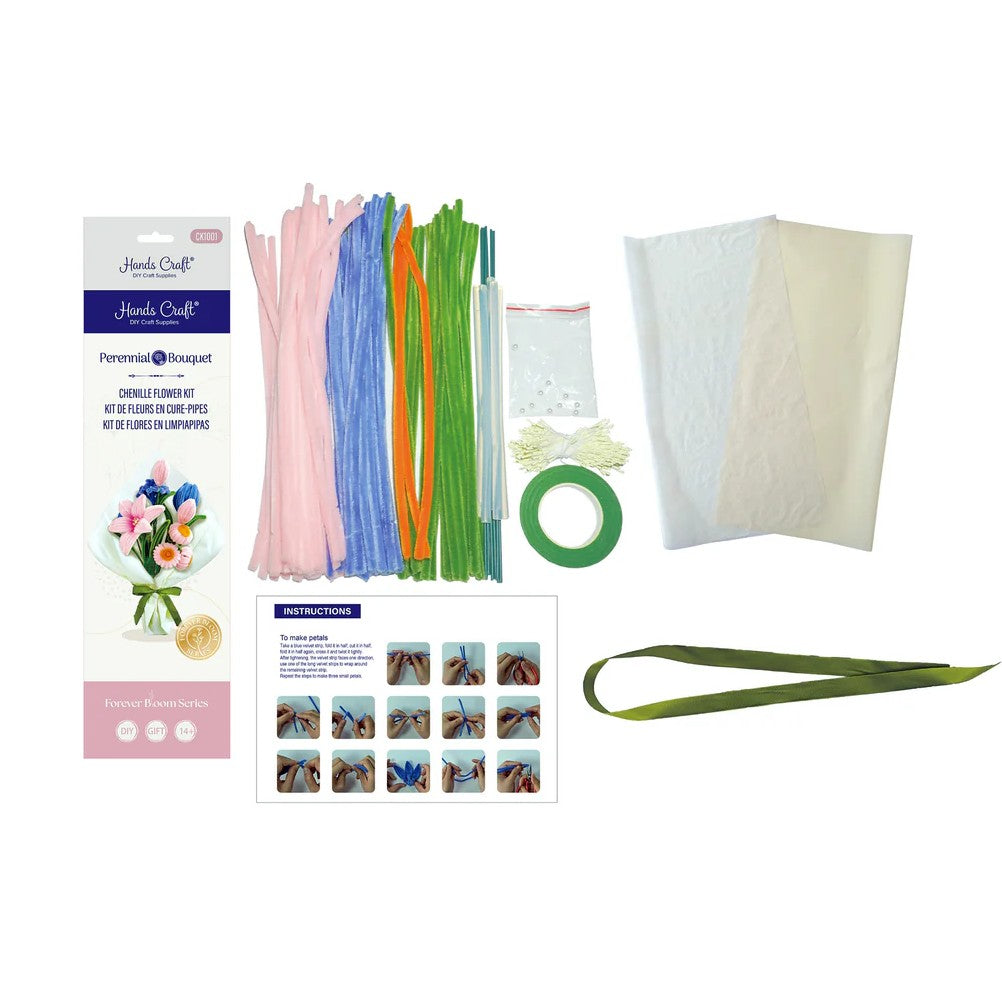 Soft, whimsical, and creatively calming - this DIY kit includes everything you need to twist, shape, and craft a stunning arrangement of pink and blue chenille blooms.