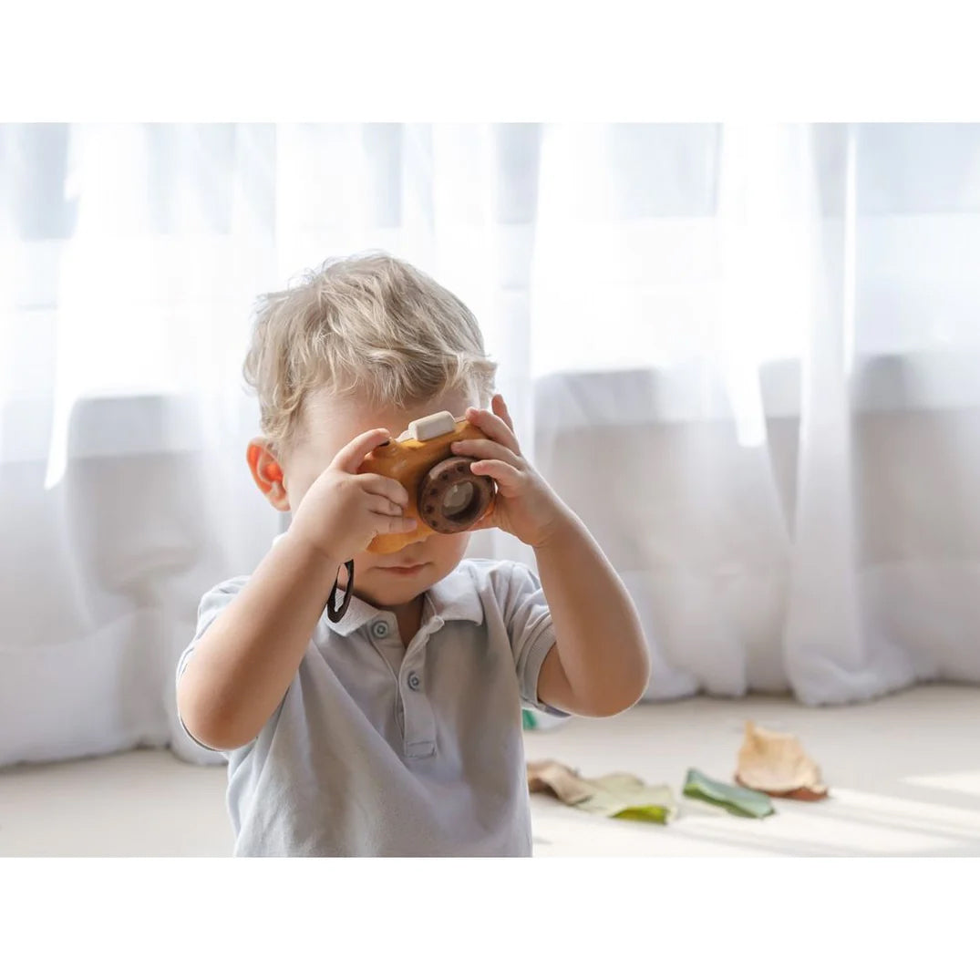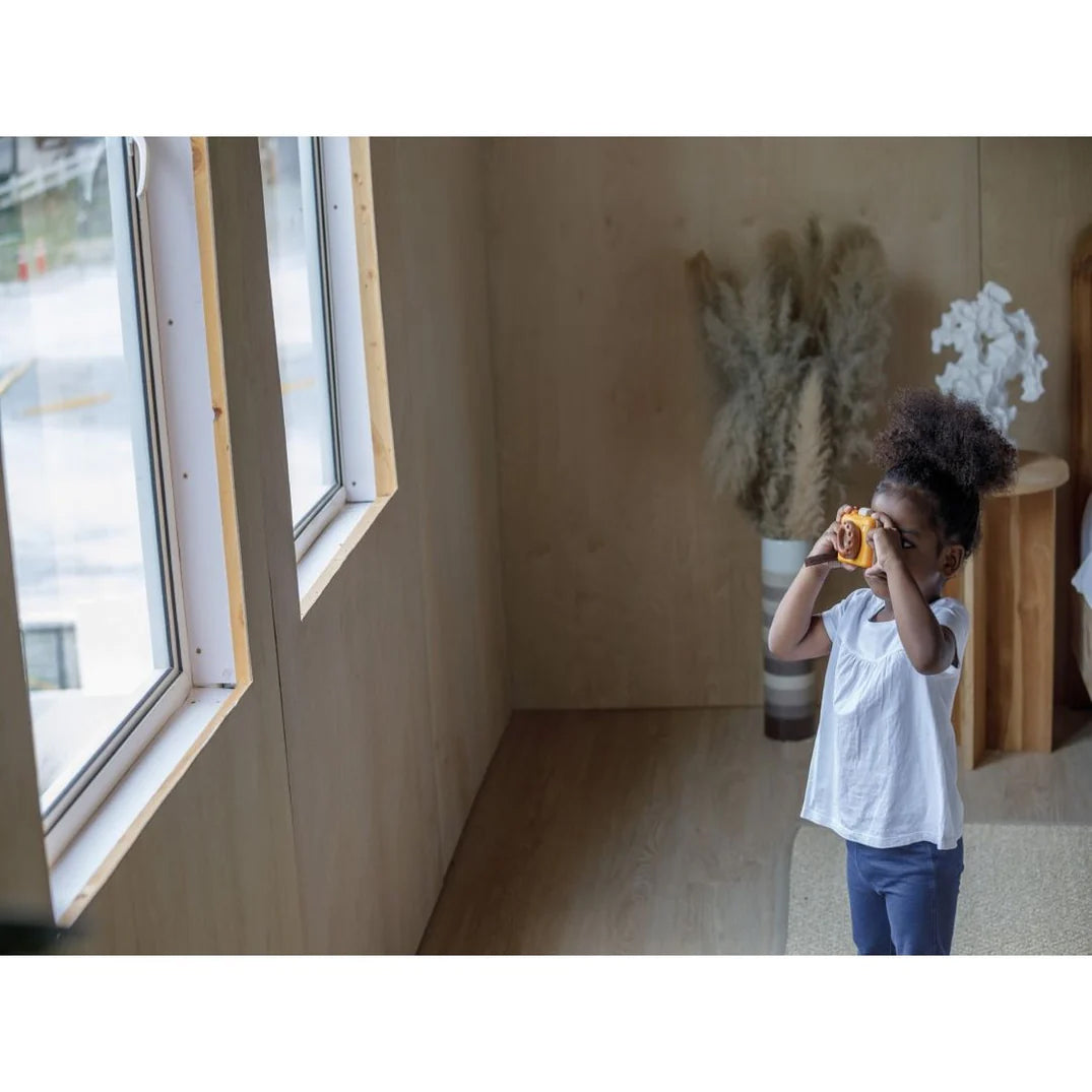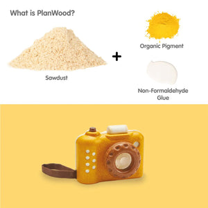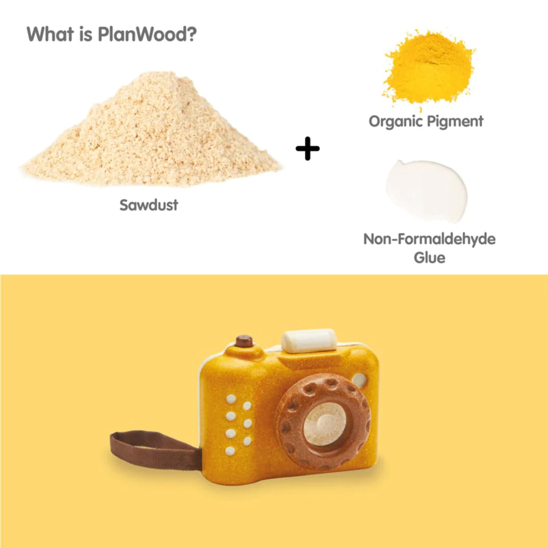 The My First Camera is crafted with PlanWood - a PlanToys material made from surplus sawdust that results in a more flexible water-resistant wood and is pigmented with water-based and natural dyes that are free from harmful chemicals. Softened edges make the camera extra child-friendly and safe.