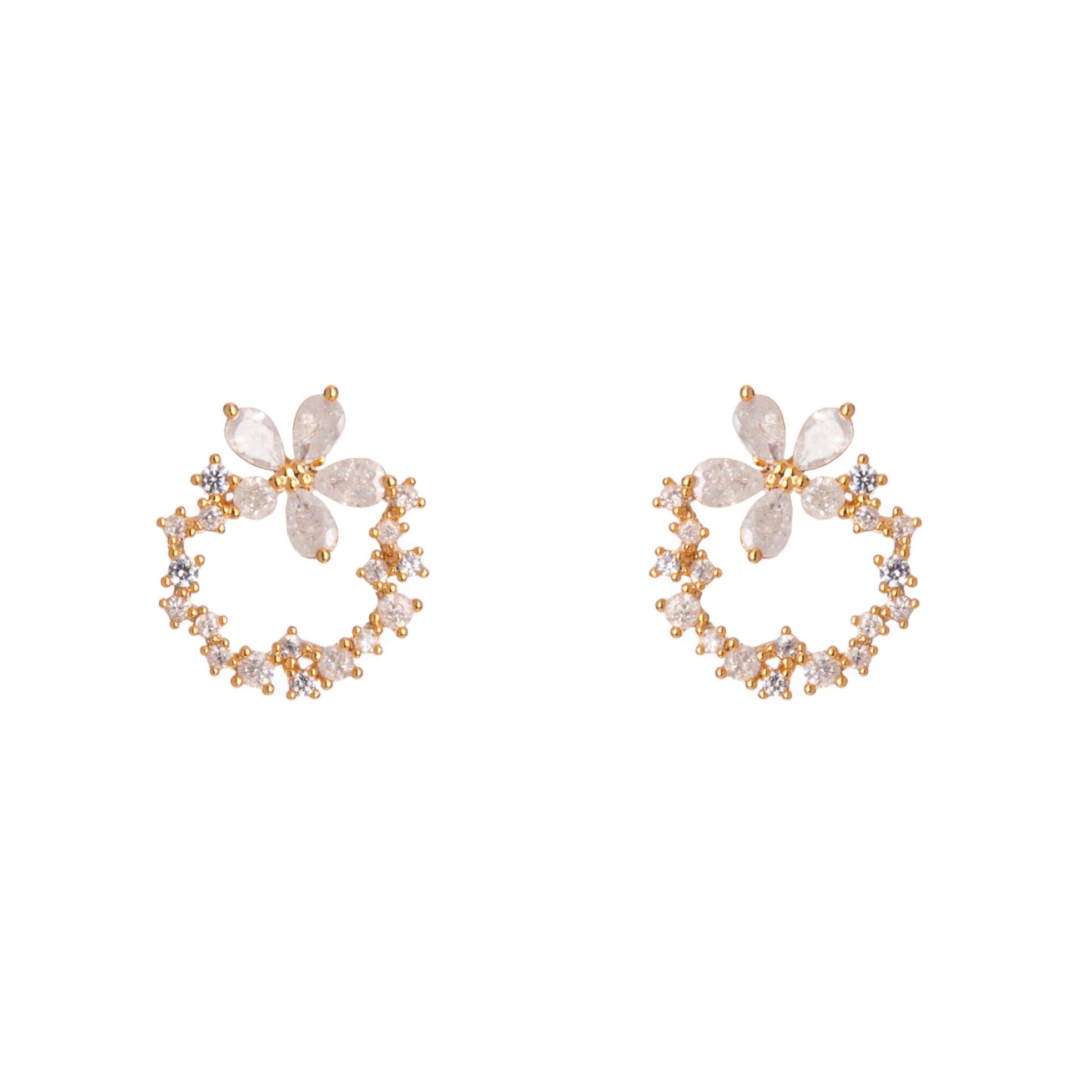 Delicate, with just the right amount of sparkle, these pretty earrings feature an open circle of tiny crystals, finished with a blossoming, miniature flower, on a base of gold-plated brass, which gives a subtle warmth to the earrings.