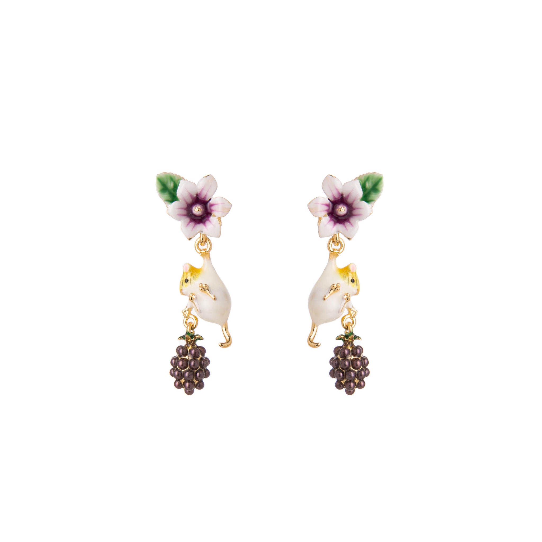 These charming earrings feature a cute little field mouse, grasping a pearlized blackberry suspended daintily below a delicate floral stud and leaf design.