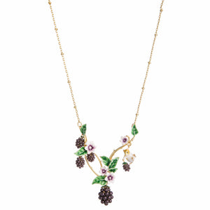 This exquisite statement piece showcases fine craftsmanship with an adorable field mouse, delicately hand-painted with gold-plated feet and tail, and poised as he clutches a pearlized blackberry, dangling playfully from a golden branch.