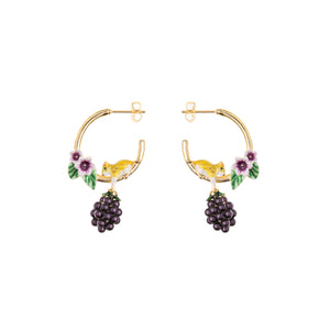 These charming Blackberry Mouse hoop earrings feature a cute field mouse nestled in a flower-adorned gold-plated hoop, playfully dangling a pearlized blackberry from within a gold-plated hoop, evoking the magic of an English hedgerow in full fruit.