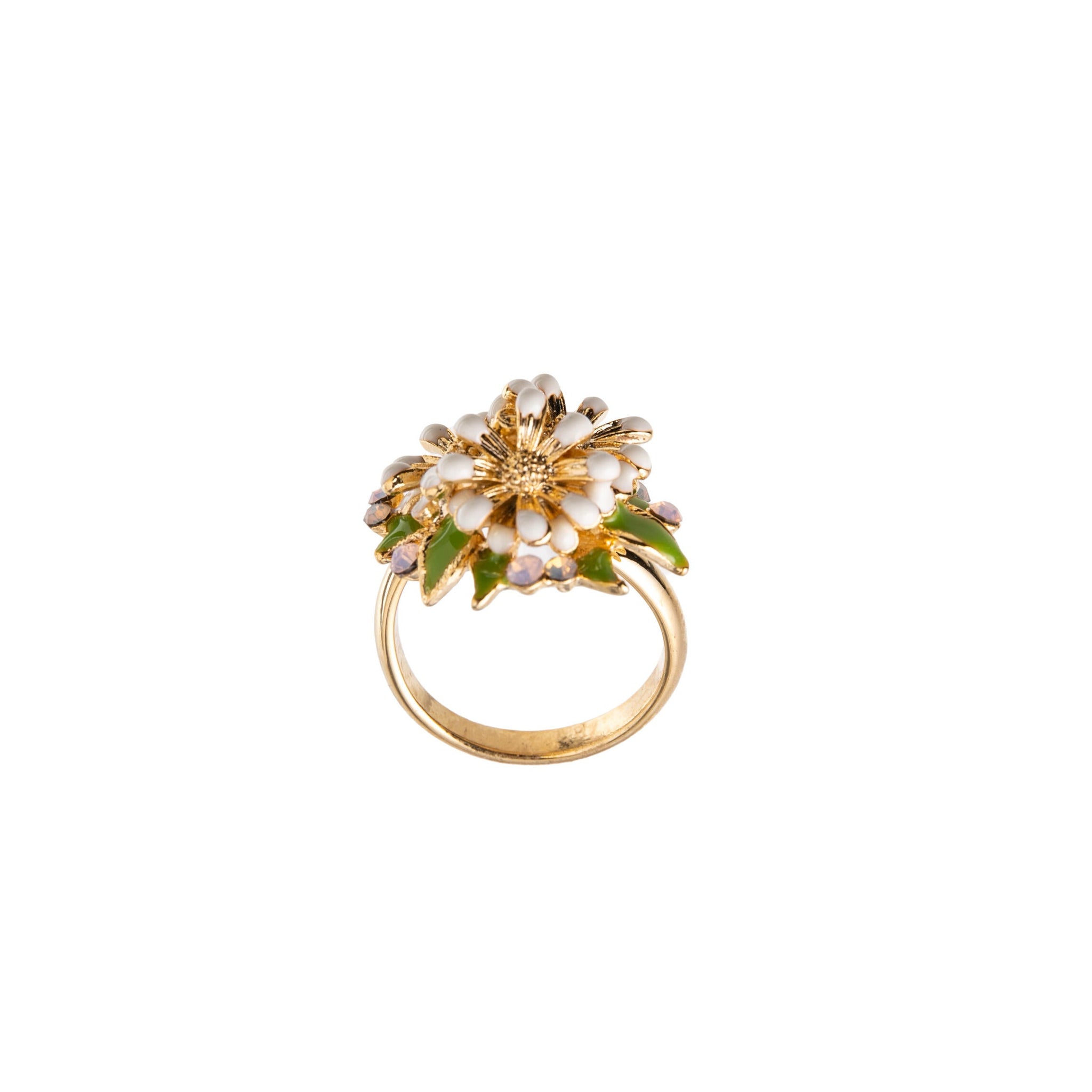This striking 'Flower Burst Ring’ captures the energy of a blossoming garden with brass and creamy enamel petals radiating like the sun’s rays.
