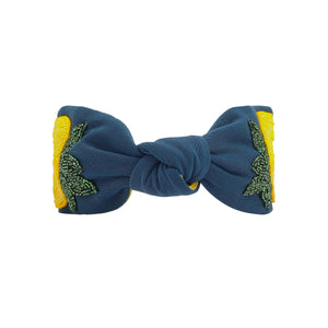 Bring a burst of freshness and elegance to your look with this striking lemon-beaded headband, crafted on a rich royal-blue fabric base and adorned with vibrant yellow citrus motifs paired with shimmering green leaf embroidery. The bold contrast creates a luxurious yet playful aesthetic, making it perfect for vacations, brunch dates, festive daytime events, and resort styling.