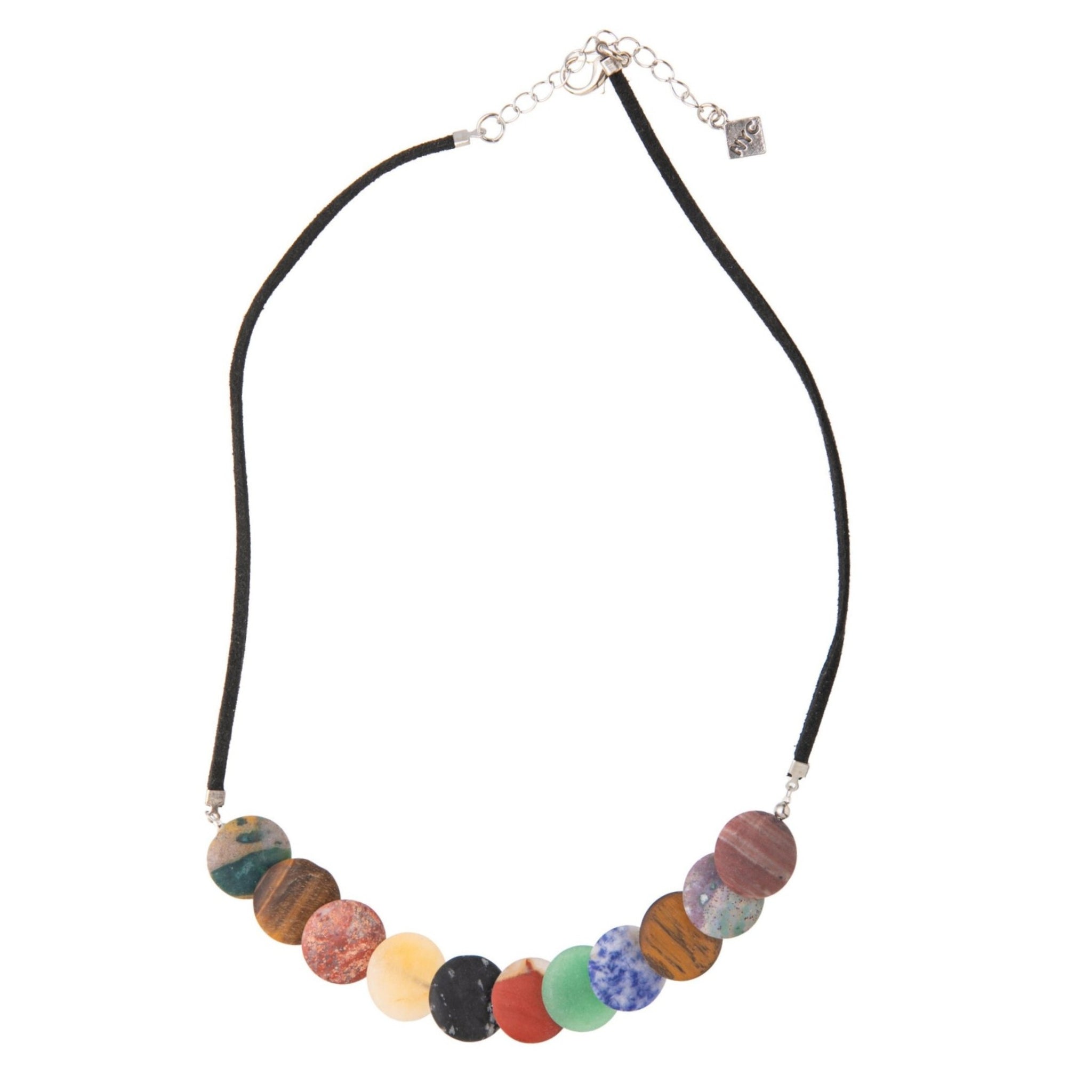 This simple yet elegant necklace showcases an assortment of matte flat disks, made from real stone, and finished with a suede cord. This naturally colorful necklace will add a hint of modern minimalism to any look.