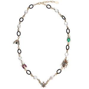 This unique necklace features five bejeweled bug charms, set on a bespoke necklace of faux pearls, black oval rings finished in antique gold, giving it a true vintage edge. This gorgeously detailed necklace will add a splash of sparkling interest to any outfit.