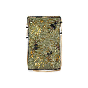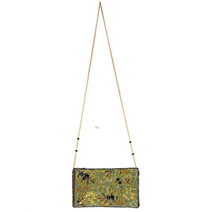 This 'Olive Branch' crossbody bag is a stunning blend of nature and elegance, featuring beadwork and embroidery that highlight lush olive leaves and delicate blossoms.