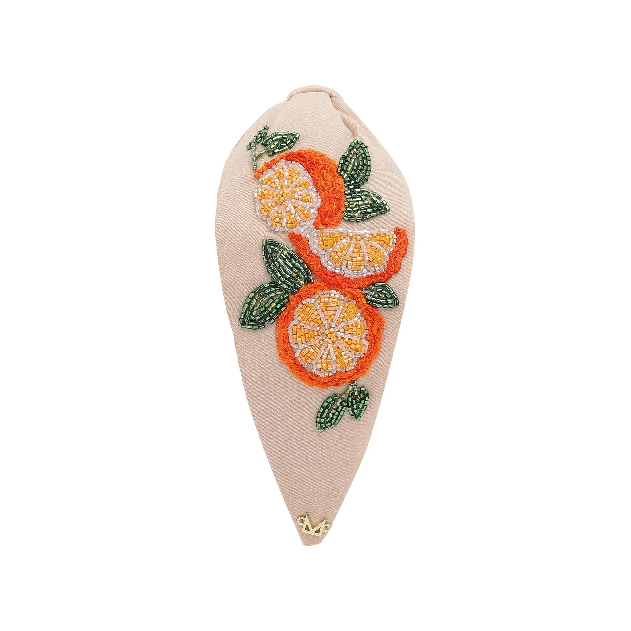 Add a splash of sunshine to your look with this beautifully embroidered citrus headband. Featuring vibrant orange slices and lush green leaves against a soft neutral base, this piece captures the fresh, playful spirit of a Mediterranean orchard.