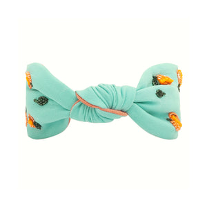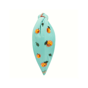 Brighten up your look with this cheerful turquoise embellished headband, decorated with sparkling, hand-beaded orange motifs and tiny green leaf accents for a fresh, playful vibe. The vibrant color combination makes this headband perfect for summer outings, brunch dates, vacations, and casual-chic styling.