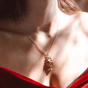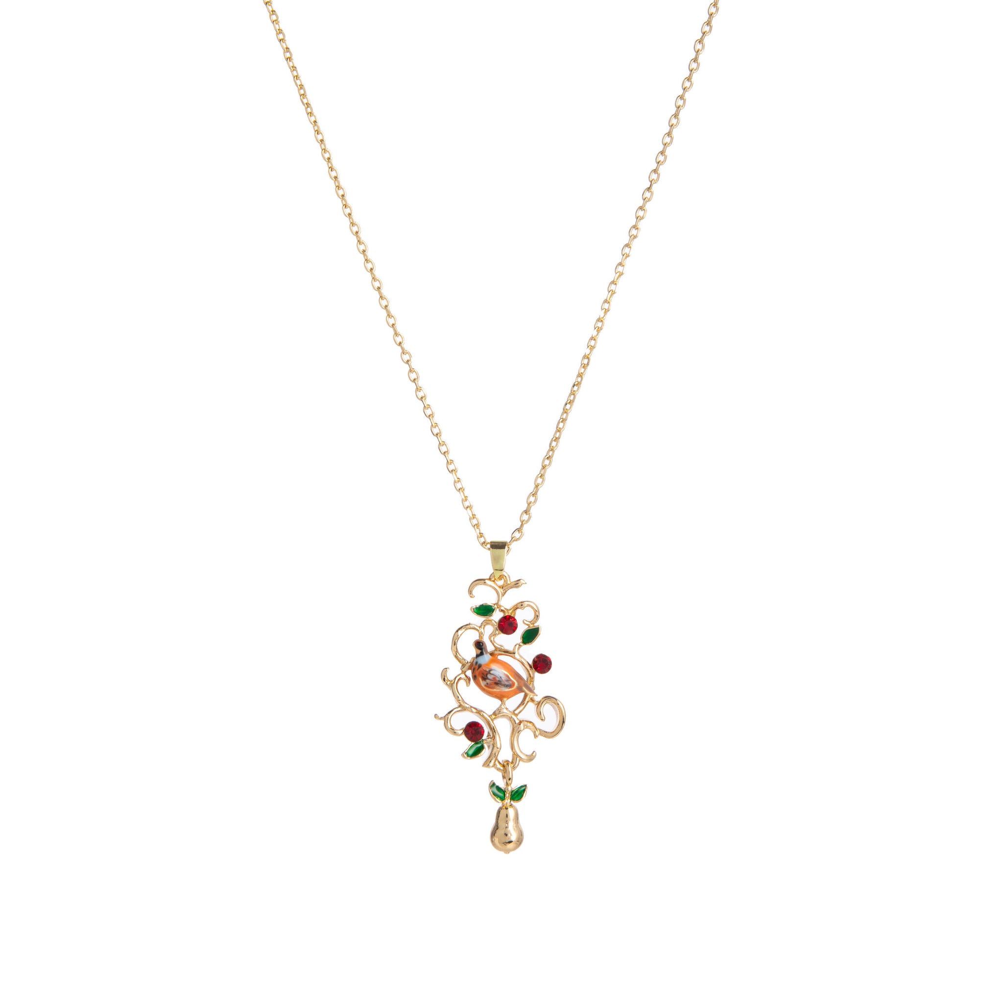 Suspended from a 45cm gold-plated chain, the pendant features a charming lattice design intertwining depictions of partridges and pear motifs. It captures the essence of holiday cheer with timeless elegance, making it a perfect accessory for the holidays.