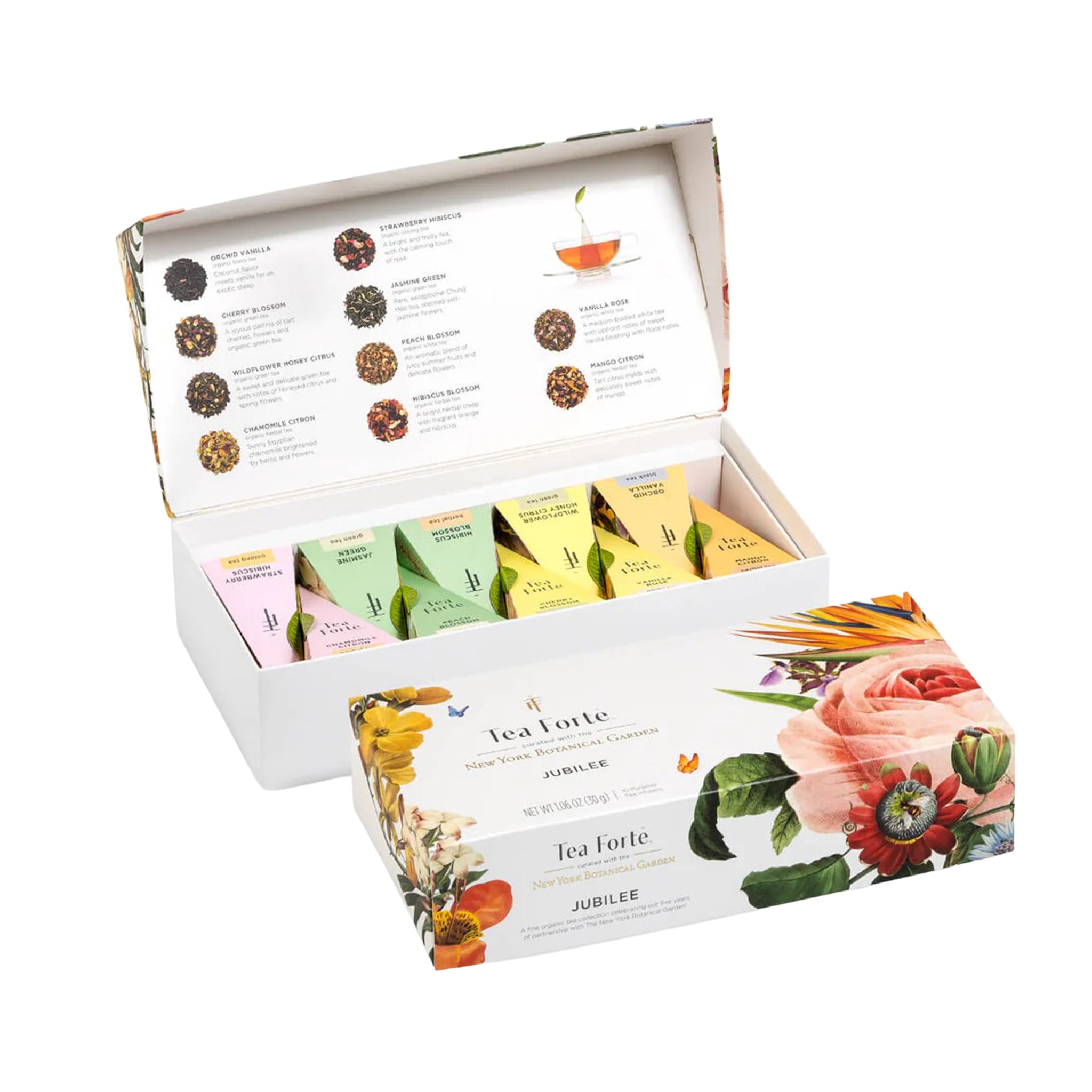 Teas included: Orchid Vanilla (Black tea), Strawberry Hibiscus (Oolong tea), Cherry Blossom (Green tea), Jasmine Green (Green tea), Wildflower Honey Citrus (Green tea), Peach Blossom (White tea), Vanilla Rose (White tea), Chamomile Citron (Herbal tea), Hibiscus Blossom (Herbal tea), and Mango Citron (Herbal tea).