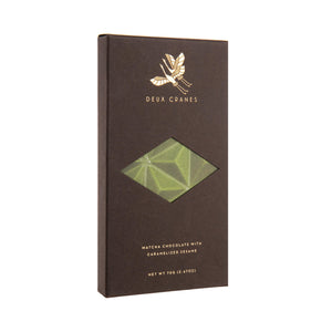 Finely ground Japanese green tea mixed with creamy, milky white chocolate. White sesame seeds are caramelized and toasted for extra crunch and bite. Like a matcha latte, but better.