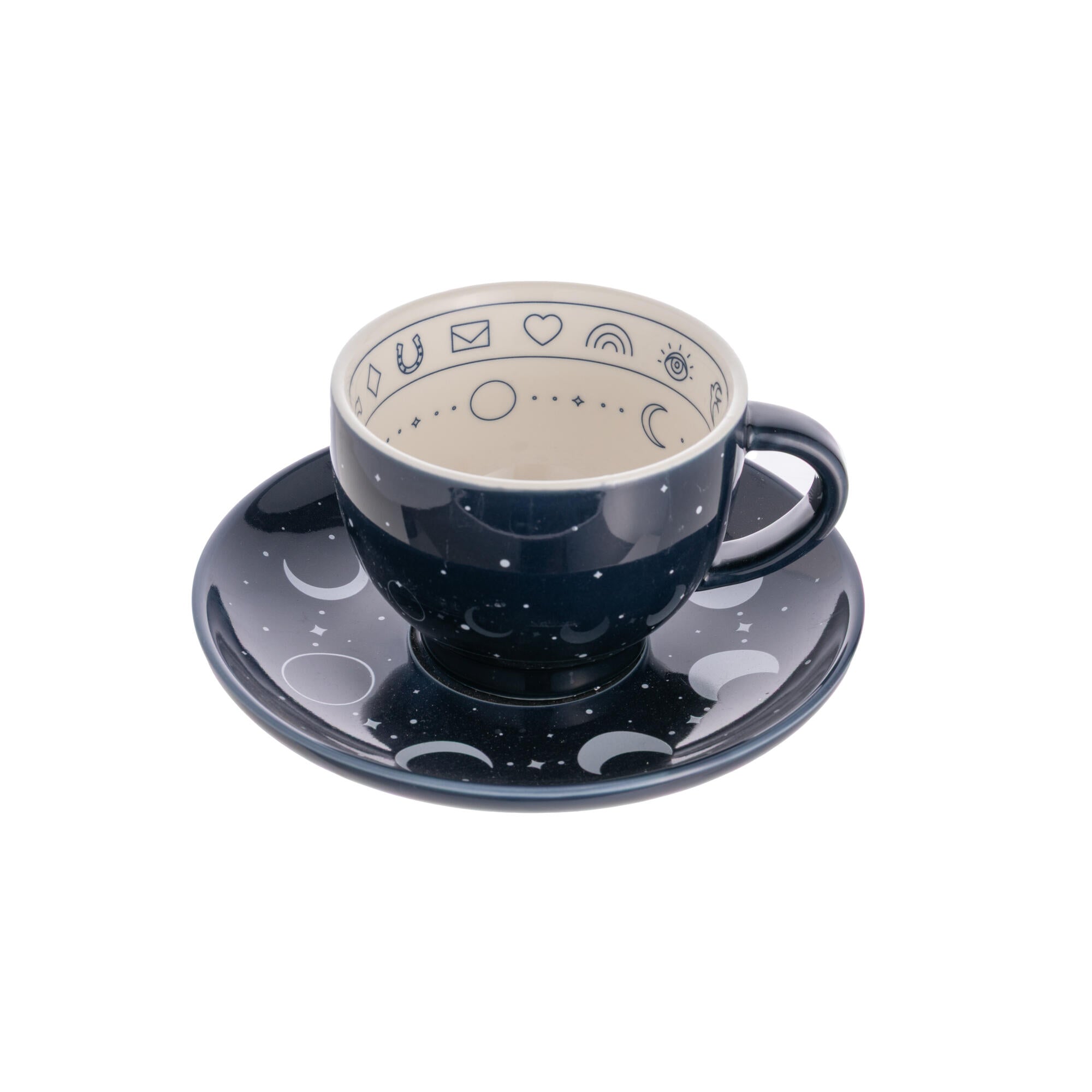 Predict your future through the age-old art of tea leaf reading with this cup and saucer. Study the placement of the tea leaves and the different shapes, symbols, and animals that you can see in the cup to read your fortune.