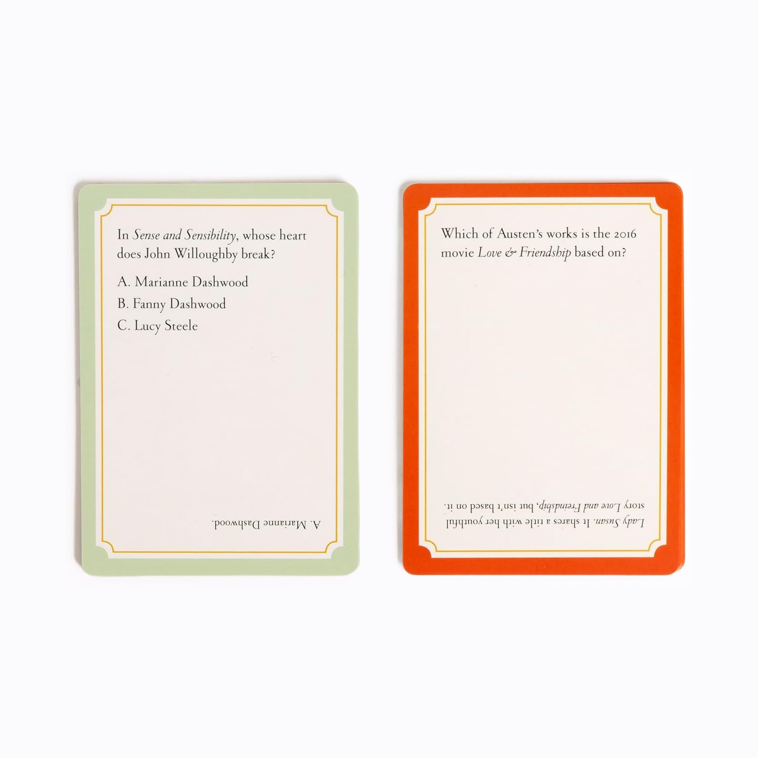 With 400 questions—200 easy and 200 hard—Jane Austen Trivia can engage a casual reader and challenge a super fan. The included booklet gives suggestions for hosting a trivia night or playing pub-quiz style with a group of friends. So send out the calling cards and get ready to play!