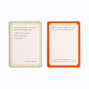 Test your knowledge of Jane Austen and her classic novels with the 400 questions in the Jane Austen Trivia card game and make it a truth universally acknowledged that you are the ultimate fan, featuring an instructional booklet outlining different ways to play.