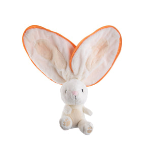 Meet Gadget, the 2-in-1 plush toy rabbit/carrot! "Did you know that rabbits are born in carrots? Nice to meet you! I'm Gadget, the cap-wearing rabbit detective. With my magnifying glass, there's no trickery I can't solve. Clad in my parka, I follow the footprints."