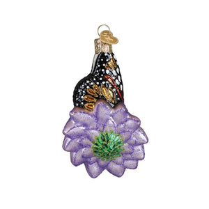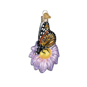 This delightful blown-glass ornament beautifully depicts a marvelously majestic monarch butterfly, gracefully perched on a glittering lilac bloom. This perfect pollinator ornament would make a great gift for any garden or nature enthusiast.