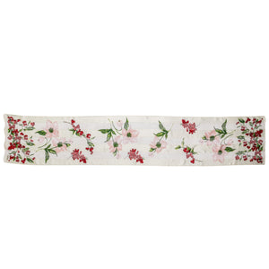This soft, gauzy, 100% silk scarf features festive pink amaryllis blooms and bright red berries on a warm cream base. The scarf has just a hint of sparkle, with a subtle gold thread stripe that catches the light beautifully.