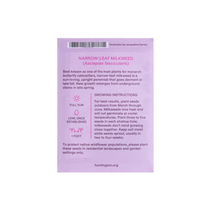 Growing instructions: For best results, plant seeds outdoors from March through June. Milkweed loves heat and will not germinate at cooler temperatures. Plant three to five seeds in each shallow hole; milkweed doesn’t mind growing close together. Keep soil moist while seeds sprout, usually in two to four weeks. Young plants need regular watering until they are established; spring showers can supplement water requirements.