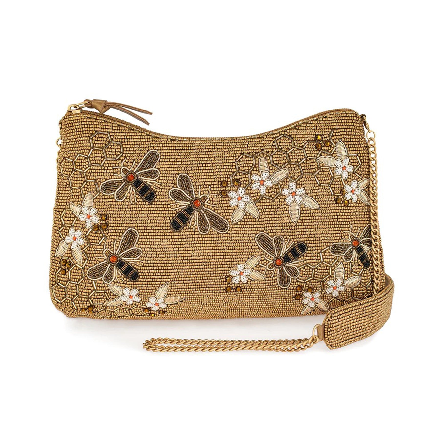 Eye-catching and unique, this purse features golden beads that are woven into a honeycomb pattern, embellished with beaded bees and flowers. It features a roomy interior, a padded shoulder strap, and a secure zipper closure, making it a functional and charming accessory to add to any wardrobe.