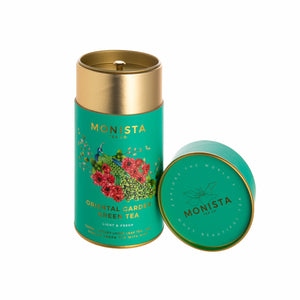 Oriental Garden Green Tea blends Sencha green tea and peppermint leaves, delivering a light and refreshing green tea without the bitter aftertaste often associated with green tea.