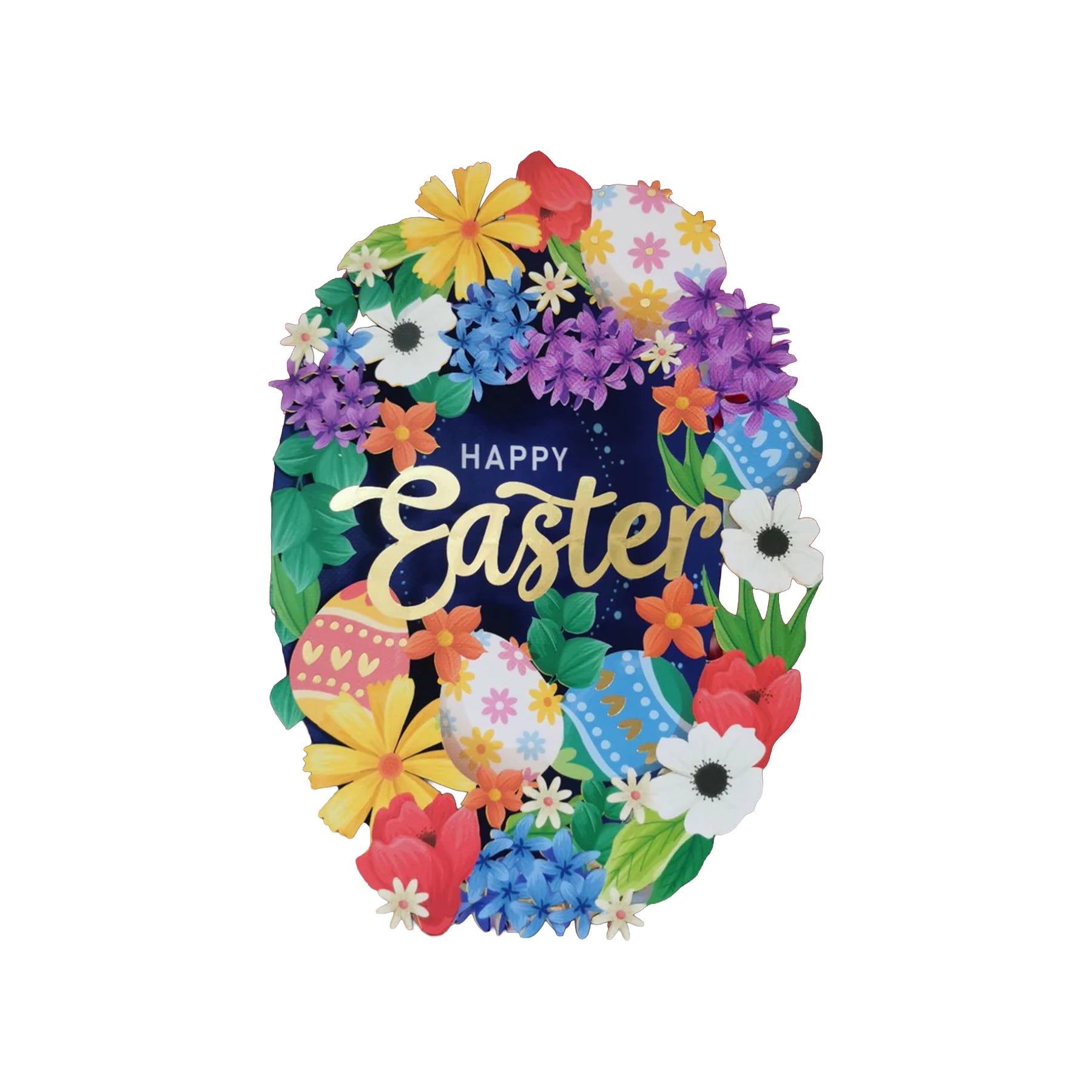 Printed on luxurious textured card with gold foil details, this colorful Easter greeting card features an intricate, die-cut floral and easter egg design.