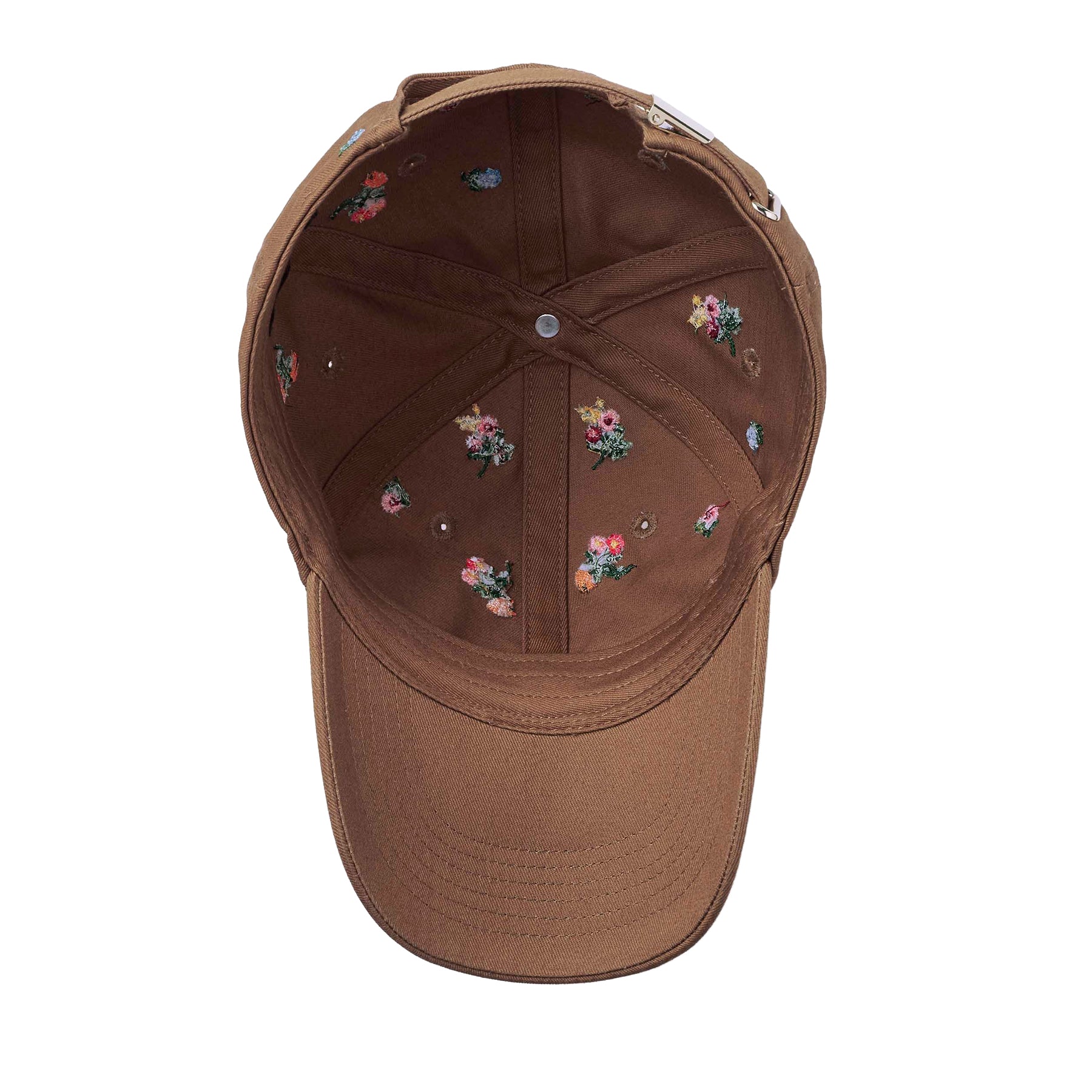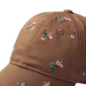 This classic six-panel baseball cap is delightfully embroidered with dahlia blooms on a warm neutral tan base.