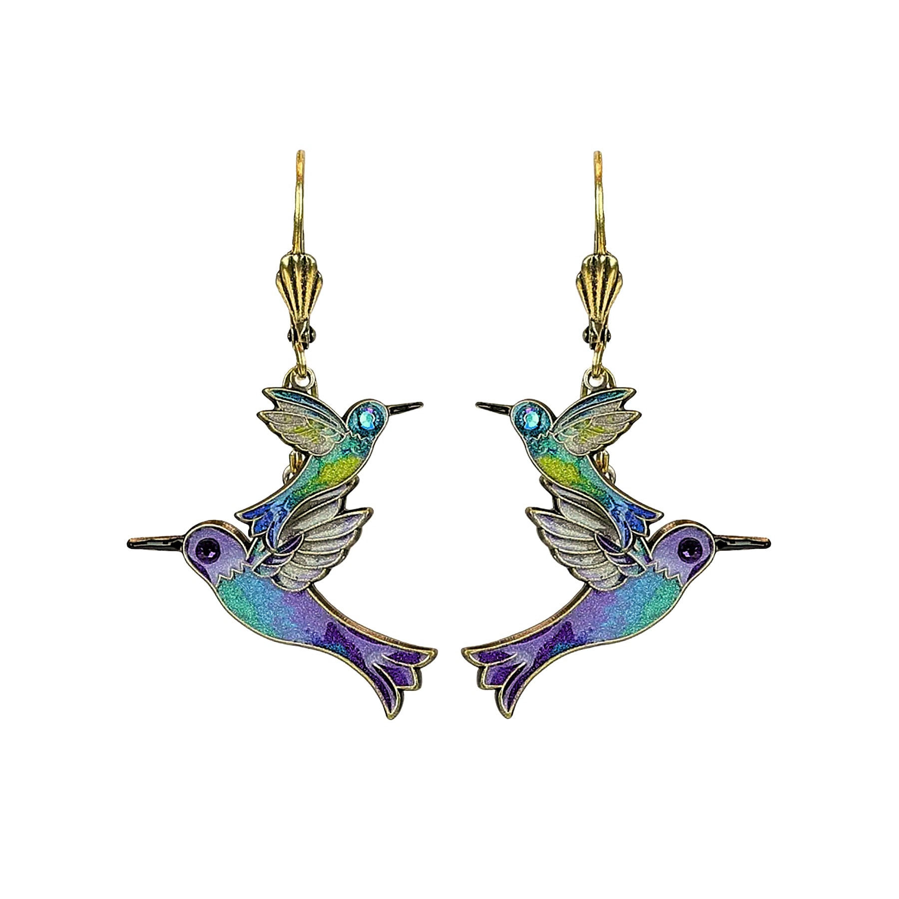 These charming green, blue, purple, and gold hand-enameled earrings depict two hummingbirds in flight, dangling in motion as symbols of good luck and messengers of hope.