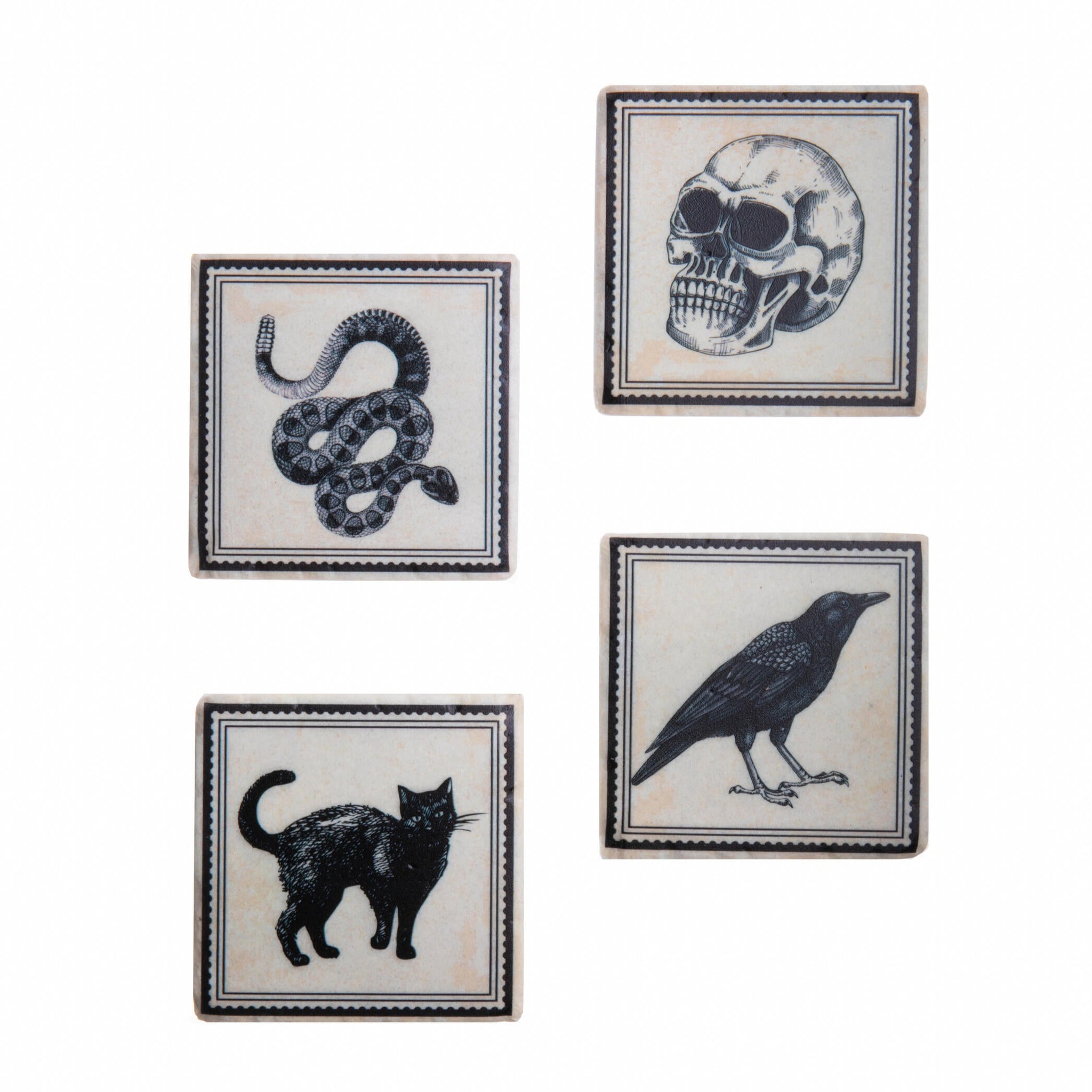 Featuring gorgeously gothic black-and-white illustrations of a snake, a raven, a black cat, and a skull, these coasters will add just the right combination of cute and creepy to your table setting during Halloween festivities and beyond. Made from an absorbent ceramic material to protect your furniture from pesky drips.