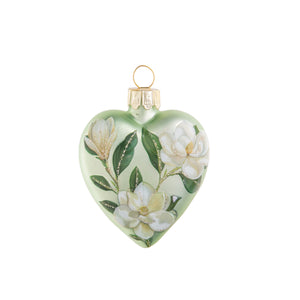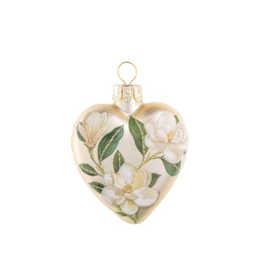 This delightful, vintage-style, double-sided glass heart-shaped ornament is adorned with a magnificent bouquet of magnolia flowers.