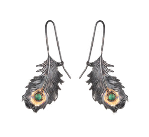 Unleash your inner peacock with these stunning peacock feather earrings, exquisitely handcrafted from sterling silver and finished with an elegant oxidized black patina. Each earring features a beautifully detailed peacock feather, adorned with a vibrant, faceted, green agate stone that glows like the iridescent eye of the feather.