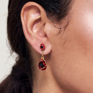 These poppy earrings feature an intricate poppy stud and larger drop suspended from a high-polished gold chain. They are finished with rich red hand-painted enamel and jet-back crystals.