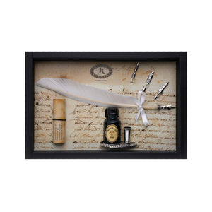 The set includes a quill pen, made from a real feather, and three interchangeable metal nibs for a variety of calligraphic styles.
