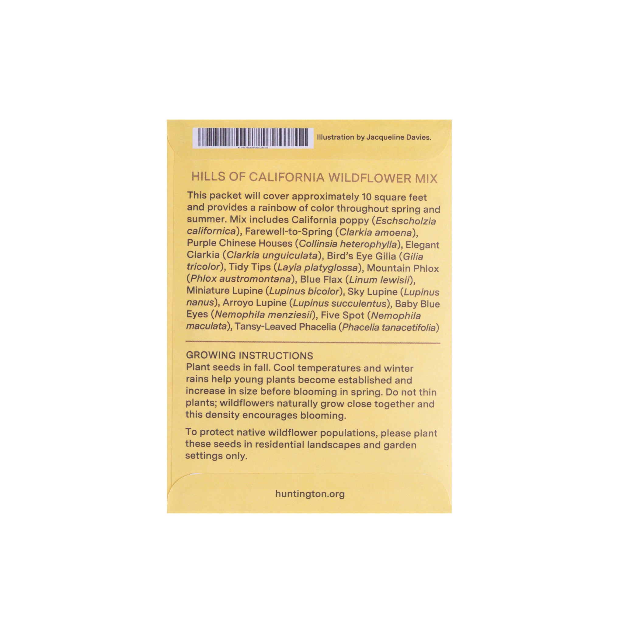 Includes: Californiapoppy (Eschscholzia californica), farewell to spring (Clarkia amoena), purple Chinese houses (Collinsia heterophylla), clegant clarkia (Clarkia unguiculata), bird’s-eye gilia (Gilia tricolor), tidy tips(Layia platyglossa), mountain phlox(Phlox austromontana), blue flax (Linum lewisii), miniature lupine (Lupinus bicolor), sky lupine (Lupinus nanus), arroyo lupine (Lupinus succulentus), baby blue eyes(Nemophila menziesii), five spot (Nemophila maculata), and tansy-leaved phacelia(Phacelia tanacetifolia).