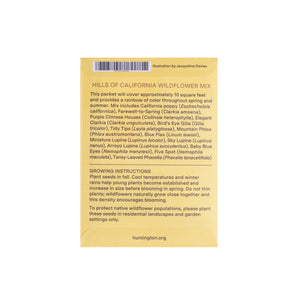 Growing instructions: Plant seeds in fall. Cool temperatures and winter rains help young plants become established and increase in size before blooming in spring. Scatter seeds evenly on freshly raked soil. Press seeds into soil and lightly cover them with a thin layer of compost or soil. Many wildflower seeds need light to sprout, so avoid planting more than one-eighth inch deep. Germination occurs between 10 and 21 days. Do not thin plants; wildflowers naturally grow close together and this density encourages blooming. Young plants need regular watering until they are established; winter rain can help supplement the watering schedule.